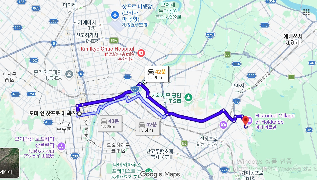 札幌호텔(08:30)→北海道開拓の村(10:00~11:30)→중식(12:30~13:20)→小樽運河(13:40~14:05)→유리세공품(14:15~15:20)→Niseco Annafree Resort(17:40)