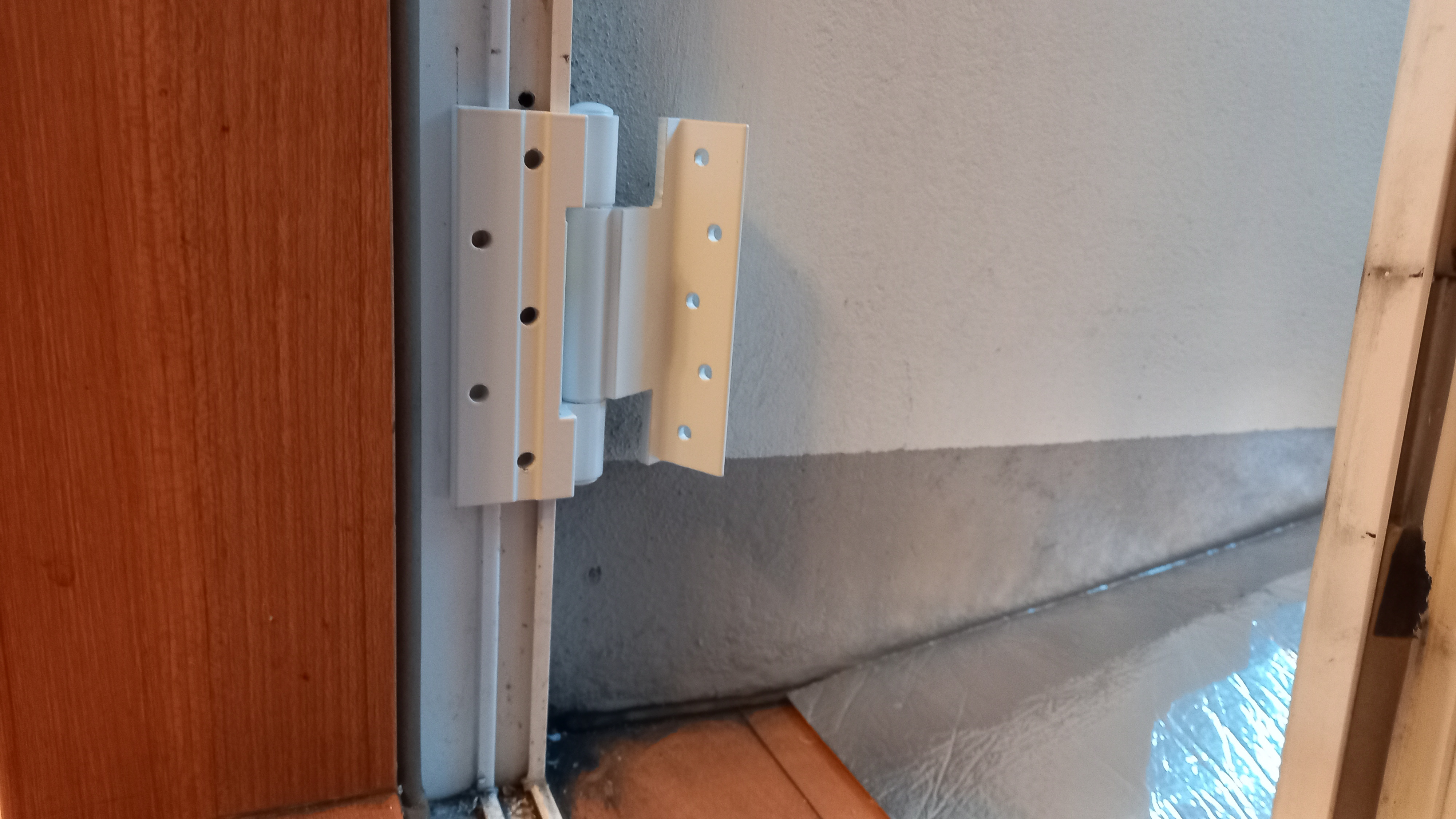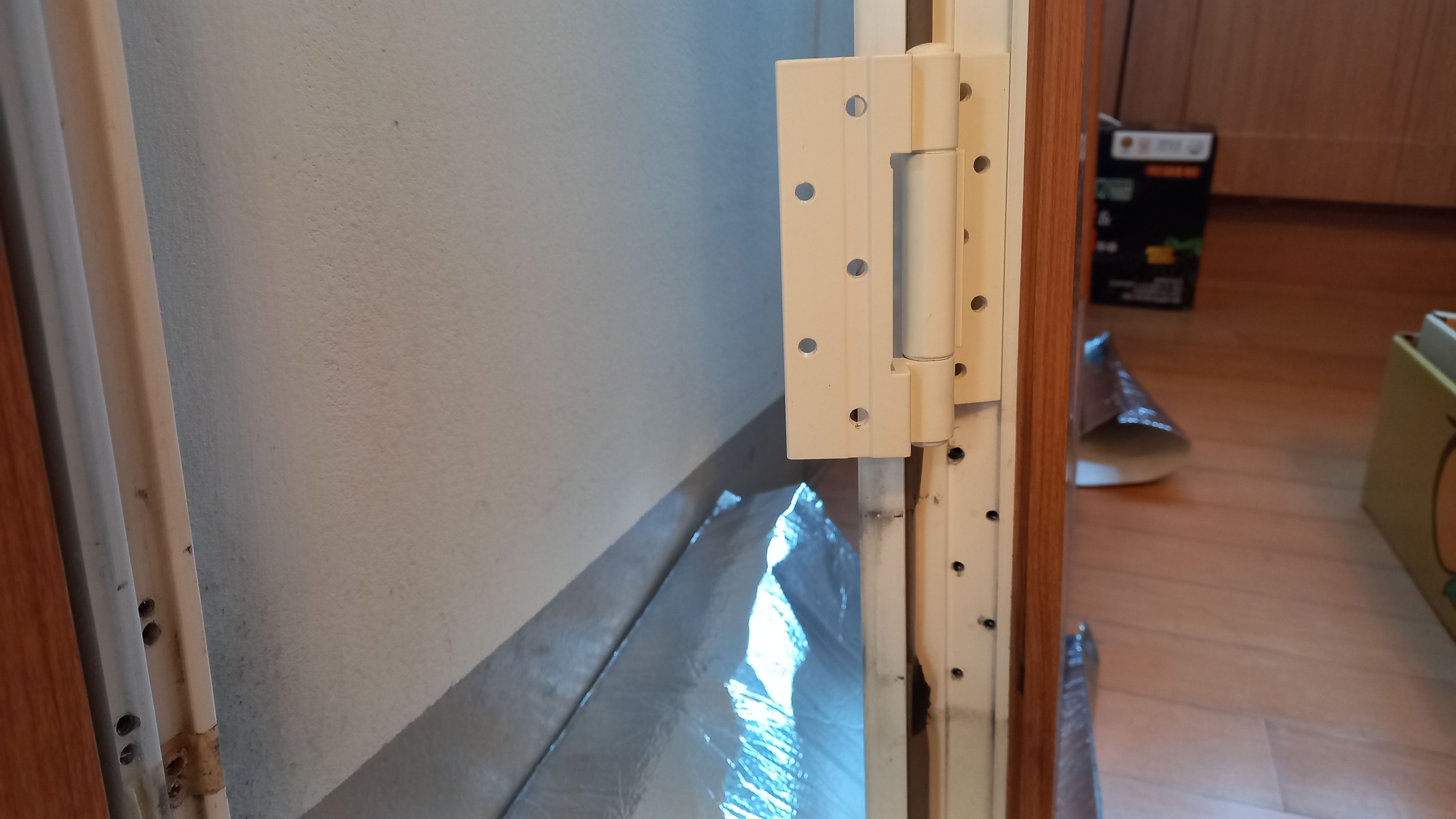받혀 놓은 상태에서 문짝이 좌우로 넘어 지지 않도록 붙잡고 경첩을 고정하는데 성공했다